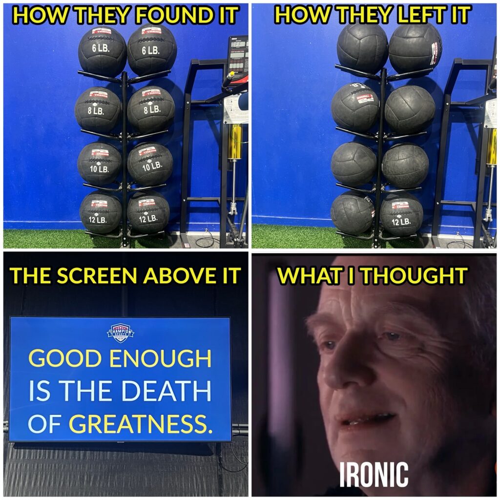 The medicine balls aren’t the point. They are a symptom and a metaphor. And that’s why we emphasize something like this as a teachable moment with our athletes. Not to call people out, but to lift and level everyone up.